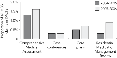The EPC MBS program was introduced in November 1999. It provided new Medicare items to increase the financial incentives for greater GP involvement in RACF care: Comprehensive Medical Assessment (CMA), multidisciplinary case conferences, GP contribution to care plans, and Residential Medication Management Review. A 2003 evaluation of the uptake of EPC items relating to RACFs found that CMA items were the most commonly claimed.17 GPs found care plans to be complex, involving a considerable amount of paperwork and time to review medical notes and test results. They also found organising case conferences to be very time-consuming and poorly remunerated for the effort involved,17 despite the evidence that conferences can be effective.18,19 There was a small increase in the number of EPC Medicare claims from 2004–05 to 2005–06, with the exception of the item relating to case conferences (Box 3). Further increases in the number of care plans could be expected with recent improved remuneration for the item relating to GP contribution to care plans.16