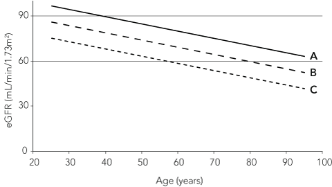 While it is commonly stated that the “normal range” for eGFR is > 90 mL/min/1.73 m2, this does not reflect the distribution of eGFR values in the Australian community presenting to medical practitioners (Box 2). By the age of 40 years, the median eGFR in the Australian community is about 90 mL/min/1.73 m2, and by the age of 80 years, the median value is 70 mL/min/1.73 m2. Thus, well over 50% of Australians aged over 40 years will have an eGFR of < 90 mL/min/1.73 m2.