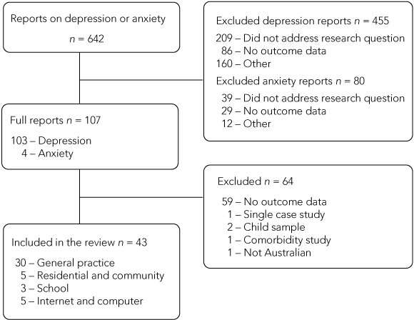 Many of the reports did not clearly describe a research program that addressed the research question (depression, n = 209; anxiety, n = 39), while others did not provide or describe outcome data (depression, n = 86; anxiety, n = 29) or were excluded for other reasons (depression, n = 160, anxiety, n = 12), usually because they focused on practitioner outcomes rather than patient or consumer outcomes. The remaining 107 reports were reassessed in greater detail by two researchers (H C and A G). Of these, 59 were excluded because closer examination revealed that they failed to report outcome data, and another five were excluded because they consisted of a case study, reported on a sample of children, were an examination of comorbidity, or reported data from overseas.