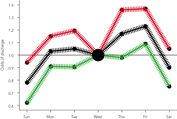 We studied 4569 patients admitted to the ICU of St Thomas’ Hospital, London, from 2002 to 2006. For each patient, we had the date of admission to and discharge from the ICU. We modelled the probability of discharge using a longitudinal survival model.1 Patients who died were censored. We modelled day of the week as a categorical variable, with Wednesday as the reference category. The model controlled for age, APACHE II (Acute Physiology and Chronic Health Evaluation) score, whether the patient was being filtrated or ventilated, and presence of health care-acquired infection. Software from the BUGS (Bayesian inference Using Gibbs Sampling) Project2 was used for the analysis.