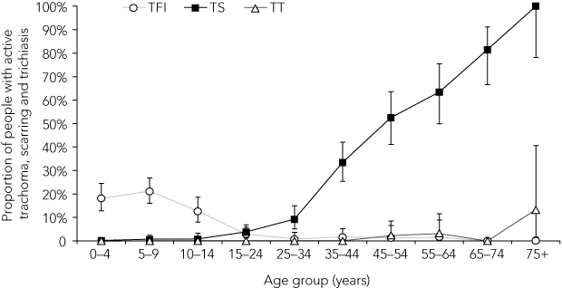 A total of 1316 people (85.2% of the total estimated population), including 415 children aged under 10 years, were screened for trachoma. Across the five communities, active trachoma (assessed as the presence of either follicles or inflammation in one or both eyes) was at an endemic level (> 10%). The prevalences of active trachoma, scarring and trichiasis in different age groups are summarised in the Box. The overall rate of active trachoma in children under 10 years of age was 19.8% (95% CI, 16.0%–23.9%) (n = 82), and two communities had hyperendemic prevalence of trachoma (> 20%) in this age group. The youngest child observed with active trachoma was just over 1 year old.