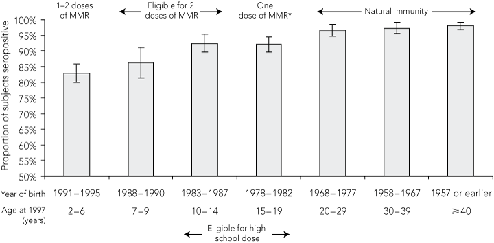 Among those born after 1990, estimated coverage for at least one dose of mumps vaccine increased from 80% in 1990 to 90% in 1995,17,18 reflected by a sharp reduction in notified and hospitalised cases. Children born in the early 1990s (aged 2–6 years at the time of sampling) had the highest proportion susceptible in 1997 (17%), but would, at most, have received one dose of MMR vaccine at that time. Although seroconversion rates after a first dose of mumps vaccine under clinical trial conditions are as high as 97%,15 under field conditions vaccine effectiveness after one dose is about 88% and approaches 95% after two doses.10