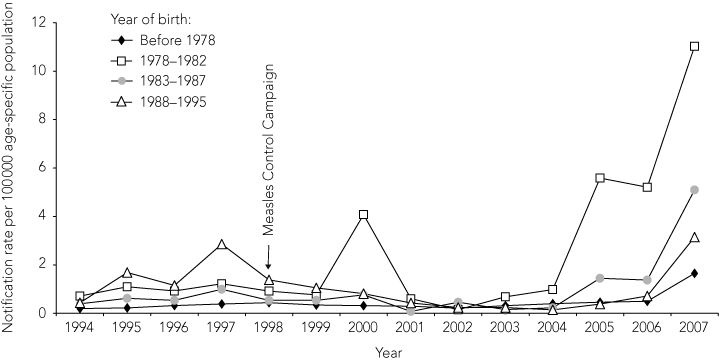 When notified cases were analysed by year of birth using broad groups corresponding to different pre-vaccination and post-vaccination eras (Box 3), the cohort born before 1978 was found to have very low and steady infection rates over the study period. In contrast, people born between 1978 and 1982 had increased notification rates, in 2000 and after 2004, while there was a progressive decline in notification rates among younger birth cohorts, particularly those born after 1987. During the period 1999–2007, the mean notification rate for the 1978–1982 birth cohort was more than threefold higher than for other birth cohorts (P < 0.001), with a significant upward trend compared with the other birth cohorts (P = 0.001).