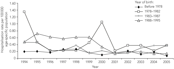 Between 1994 and 2005, 605 recorded hospitalisations were coded for mumps, including 464 (77%) with mumps as the principal diagnosis. Hospital admissions occurred in all age groups and in both sexes, with a male : female ratio of 1.2 : 1 (P = 0.03). The age distribution of hospitalised cases, using the same birth cohorts as for notifications, is shown in Box 4. Notably, for the period 1994–2005, the birth cohort of 1978–1982 had a significantly higher mean annual hospitalisation rate than pre-1978 and post-1982 birth cohorts (P = 0.04). Hospitalisation rates for cohorts born both before 1978 and after 1982 were low, and declined over time.