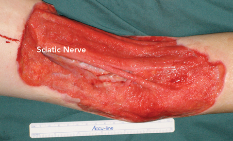 Antibiotic therapy with 6-hourly intravenous Timentin (ticarcillin–clavulanate) (GlaxoSmithKline Australia) 1.5 g was commenced. Wound and tissue cultures revealed the presence of Staphylococcus aureus and Prevotella species. Although fungal cultures were requested, no fungal pathogen was isolated. The popliteal fossa wound and necrotic inguinal nodes were surgically debrided over the following 2 weeks. This revealed extensive necrosis of the biceps femoris and semimembranosus muscle, with undermining subcutaneous fat necrosis immediately adjacent to the wound. Ten centimetres of sciatic nerve and the popliteal vessels were exposed. Both wounds were treated by topical negative pressure (vacuum) dressing (VAC Therapy System, Kinetic Concepts Inc, San Antonio, Tex, USA).