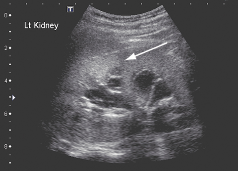 After 5 weeks of treatment with amphotericin B, the patient became unwell, with a high fever and moderate renal impairment. His creatinine level had increased from 0.06 to 0.17 mmol/L (RR, 0.03–0.08 mmol/L); his urea level was 18.7 mmol/L (RR, 2.1–6.5 mmol/L), and the glomerular filtration rate was 29 mL/min (RR, 100–140 mL/min). A renal ultrasound scan revealed parenchymal fungal spores (Figure B). Amphotericin B treatment was ceased and twice daily oral posaconazole 400 mg commenced. Renal function normalised within about 7 days. Follow-up imaging 6 weeks later revealed resolution of renal fungal disease.