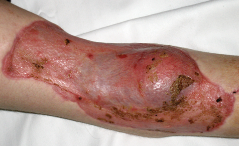 A: Necrotising wound of the left popliteal fossa on presentation.