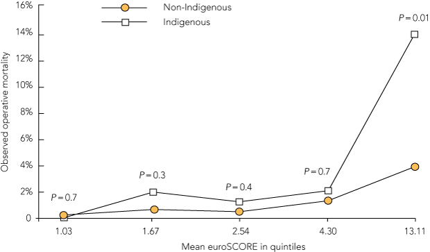 4 Operative mortality of Indigenous and non-Indigenous patients, divided into quintiles of baseline euroSCORE*