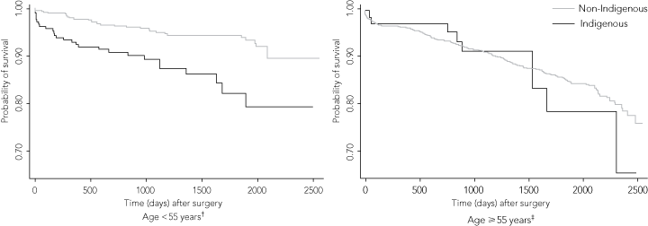 Consistent with previous analyses are the differences in baseline characteristics of Indigenous patients presenting with symptomatic cardiovascular disease.18-20 Not only are there significant age differences, but the severity of heart disease appears different. Rheumatic valvular disease and premature coronary atherosclerosis are both major health problems in Indigenous populations and are responsible for the marked age discrepancy in our cohort presenting for cardiac surgery. However, the younger age of onset and severity of heart disease do not completely explain the adverse outcomes, as disparity in outcomes persisted after risk adjustment. Differences in late mortality must also take into account the known higher rate of non-cardiovascular mortality in Indigenous populations.1