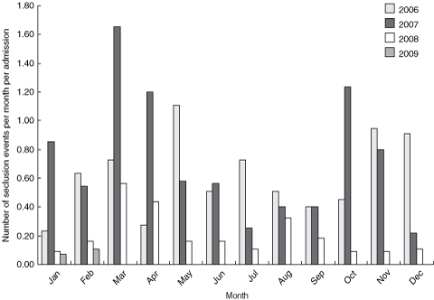 Before the introduction of TeamSTEPPS, the initiation of seclusion in patients was determined by individual clinicians, and seclusion rates were variable (Box 3). The introduction of “huddles” (ad hoc gatherings of clinical staff to re-establish a clear and accurate understanding of the patient’s current status and plan of care)14 and a structured team approach has established a team commitment to resolve aggression, with seclusion used as a last resort. Seclusion rates before implementation (ie, before February 2008) were significantly higher than after implementation (from May 2008) (Mann–Whitney U test, Z = –4.1; P < 0.001).