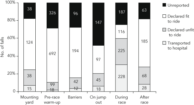 Results: There were 3360 jockey falls from 748 367 rides. Falls occurred at a rate of 0.42 per 100 rides in flat races and 5.26 per 100 rides in jumps races. In flat racing, 54.6% (1694/3101) of falls occurred before the start of the race and 11.1% (344/3101) of falls occurred post-race. The 34.3% (1063/3101) of falls that occurred during flat races resulted in 61.7% (516/836) of the injuries sustained. In jumps racing, most falls occurred at a jump and 9.7% (25/259) of jockeys who fell were transported to hospital and/or declared unfit to ride. There were five fatalities resulting from falls during the study period, all in flat racing. Fall and injury rates were comparable with those found in the United Kingdom, Ireland, France and Japan.