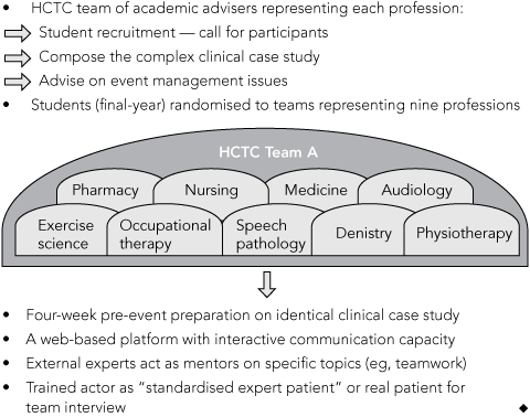 UQ offers a range of interprofessional learning opportunities within its curriculum. In 2005, an IPE fellowship was established by the Faculty of Health Sciences. It sought innovative proposals capable of stimulating multilevel cultural change to accelerate acceptance of IPE philosophies and practices.1,11 The fellowship project, jointly awarded to two of us (R A B and M C M), proposed to implement an HCTC at UQ and explore the potential for a national competition.