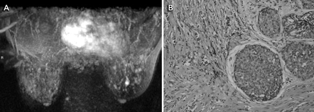 MRI also increases the likelihood of recall for investigation of false-positive findings, although the evidence is not consistent across studies. Two studies observed that the addition of MRI produces at least a threefold increase in risk of undergoing percutaneous needle biopsy (PNB) for benign findings.17,18 One of these studies also reported a twofold increase in risk of surgical biopsy for benign findings.17 Another study did not find a significant difference in the rate of PNB when MRI was added to mammography, but did not report data on surgical biopsy.16