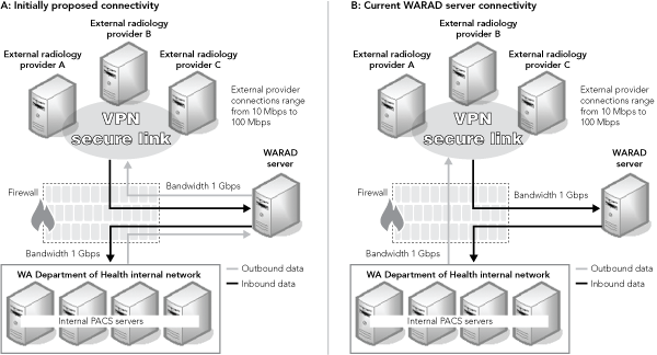 The pilot project was funded by an initial grant of $100 000 from the DoH. To implement the project, the working group initially proposed to set up a dedicated server, the Western Australian Radiology (WARAD) server outside the DoH firewall (in the “demilitarised zone” [DMZ]) that could receive images from the private sector for retrieval by the public hospital PACS. Similarly, the public hospital PACS could send images to the WARAD server for retrieval by the private sector (Box, A). However, because of security issues, an alternative model was developed whereby the WARAD server could receive images from the private sector for the public system but images for the private sector would be sent directly to the private provider’s network via secure virtual private network (VPN) links (Box, B). The VPN provides an exclusive link to the WARAD server, which is more secure than transferring data via a public internet connection.
