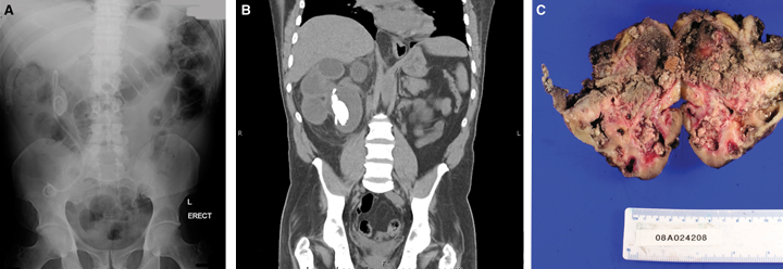 The prospect of a “missed” stent is a constant source of anxiety to the practising urologist. Stents that have been inadvertently left in situ for many months act as niduses for stone formation, particularly at the proximal and distal coils, which may prevent easy stent removal. Encrustation increases stent fragility and may lead to its fragmentation, even during careful attempts at removal. Multiple procedures may be required to remove the stent completely. Encrustation may also impair urine drainage, resulting in unrecognised renal obstruction and silent kidney damage, necessitating nephrectomy. As in our patient, long-term obstruction may cause persistent infection and recurrent episodes of clinical pyelonephritis and subsequent pyonephrosis. From a biological viewpoint, it is not surprising that the combination of stent irritation and infection would lead eventually to malignant transformation,3 although to our knowledge this is the first reported case of ureteric carcinoma associated with a retained ureteric stent.