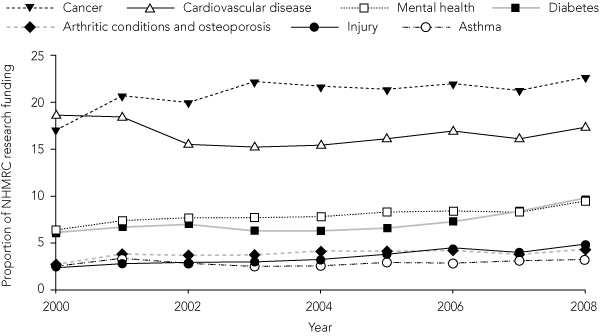 In Australia, since the late 1980s, a series of health policy documents has been developed to guide allocation of government resources.3 One of the most influential policy decisions has been to identify National Health Priority Areas (NHPAs).4 There are currently eight NHPAs: cardiovascular disease (CVD), cancer, injury, mental health, diabetes, asthma, arthritis and musculoskeletal conditions, and obesity. (Obesity has only recently been designated an NHPA and is not included in our analysis.)