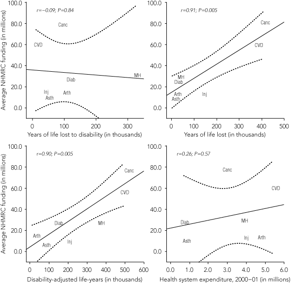 Regression models examined whether any measures of disease burden were associated with NHMRC research funding (Box 3, Box 4). The amount of NHMRC funding allocated to each NHPA was strongly correlated with YLL and DALYs, but not with YLD or health system expenditure. Diabetes and cancer each received more grants, and injury and mental health fewer grants, than would be expected if their respective proportional contribution to total NHPA-related DALYs were used as the determinant of NHMRC funding allocation.