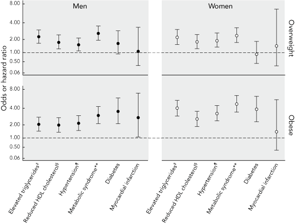2 Sex-specific adjusted* odds or hazard ratios† (and 95% confidence intervals) among Australian adults aged 25–75 years for the development of various clinical outcomes over 5 years in those classified as obese or overweight on the basis of waist circumference at baseline, compared with those with a normal waist circumference at baseline