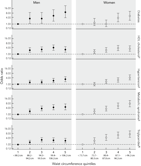 To assess risk over the continuum of waist circumference, ORs for incident type 2 diabetes, the metabolic syndrome, hypertension and dyslipidaemia were plotted against quintiles of waist circumference. Myocardial infarction was not included because of the small number of cases in each sex-specific waist circumference quintile. Increases in risk begin below the cut-off point for overweight (Box 3), with statistically significant increases in the odds of all outcomes in men, and with elevated triglyceride levels, reduced levels of HDL cholesterol and the metabolic syndrome in women being observed by the second quintile of waist circumference (73.7–80.3 cm in women; 88.2–94.2 cm in men).
