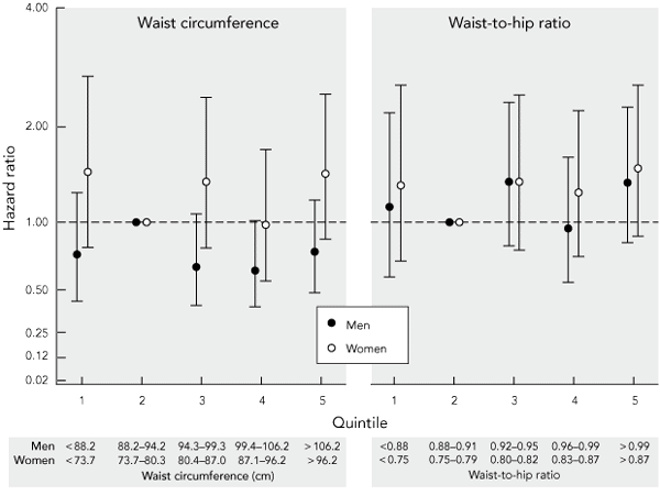 Hazard ratios for all-cause mortality over 8 years of follow-up were plotted against quintiles of waist circumference and waist-to-hip ratio, adjusted for age, history of CVD, non-skin cancer and smoking status (Box 4). Even though a weak J-shaped relationship between increasing levels of obesity and mortality was evident for waist-to-hip ratio in women, this did not reach statistical significance in any quintile. No trend of increasing risk of death with increasing obesity was evident for waist circumference in women, or for waist circumference or waist-to-hip ratio in men. Similar results were obtained after excluding smokers and those reporting a history of CVD or cancer; or when deaths in only the first year (rather than 2 years) of follow-up were excluded or when no deaths were excluded.