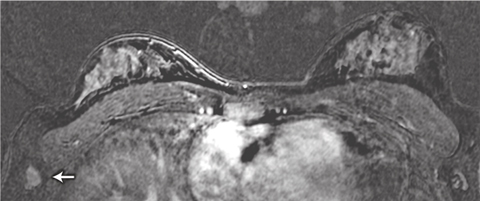 We identified two patients with lesions potentially putting them at higher risk of breast cancer and one with metastatic cancer in an axillary lymph node. The lymph node metastasis was not initially identified in the MRI scan: the patient palpated the node herself 1 month after imaging was done, and when the MRI scan was viewed retrospectively, the metastasis was in fact visible (Box 5). The patient’s imaging occurred early in the study, and failure to detect the cancer was the result of inexperience in interpreting breast MRI scans at that stage. This underlines the importance of carrying out breast MRI examination and reporting in centres that have expert multidisciplinary experience in breast surveillance, including MRI.