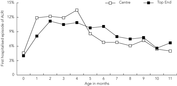 1 Frequency distribution (%) of the first episode of acute lower respiratory infection (ALRI) requiring hospitalisation in Northern Territory Indigenous children aged < 12 months, by age in months and NT region
