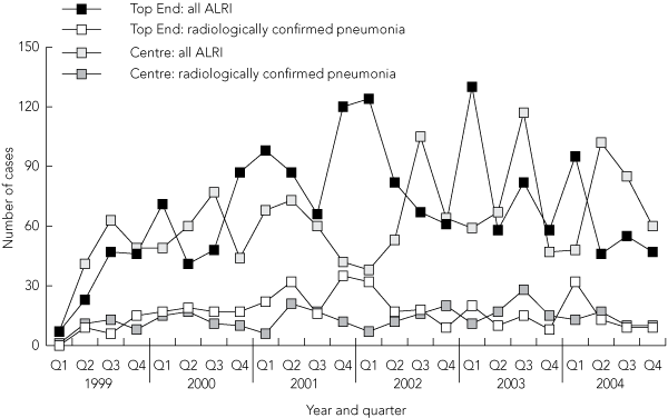 There were clear differences in temporal trends of ALRI diagnoses by NT region (Box 2). The associated diagnoses were dominated by seasonal peaks for bronchiolitis in the first quarter of the year in the Top End and in the third quarter of the year in the Central Australian region. Influenza outbreaks accounted for peaks apparent in the fourth quarter of 2000 and third quarter of 2003 in both regions. Seasonality was less clear for radiologically confirmed pneumonia.
