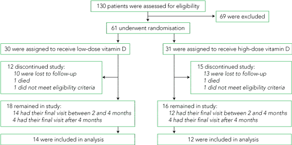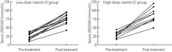 Results: Twenty-six patients completed the study within 3 ± 1 months. The mean increases in serum 25(OH)D were similar in both the high- and low-dose groups (to 55 v 51 nmol/L, respectively; P = 0.9). There was no significant difference in the proportion of subjects who attained serum 25(OH)D concentrations > 50 nmol/L between the high- and low-dose groups (9/10 v 13/14, respectively; P = 1.0). Hypercalciuria (urine calcium > 7.5 mmol/day) occurred in three patients (two low-dose, one high-dose), while renal impairment worsened in one patient. No patient developed hypercalcaemia (corrected calcium > 2.6 mmol/L), vitamin D toxicity (25(OH)D > 200 nmol/L) or nephrolithiasis during the study.