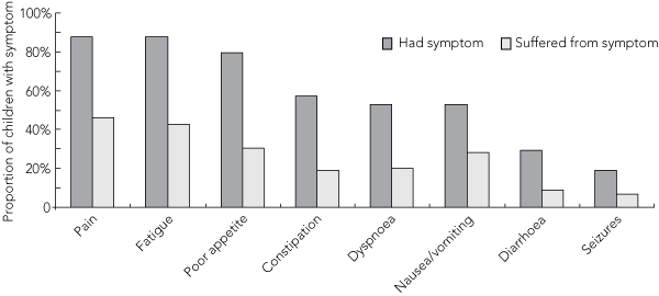 As in other international studies, pain, fatigue and poor appetite were the three most commonly reported symptoms during the end-of-life period. The rates of these symptoms in our Australian population appeared to be very similar to those reported previously in US, European and Japanese populations (Box 5). It was pleasing that, in our study, a substantial proportion of children who experienced significant suffering from symptoms received treatment. However, it was disappointing that current treatments appear inadequate, with success rates of under 50% for all symptoms and under 20% for symptoms such as fatigue, poor appetite, constipation and diarrhoea. Given the positive impact that specialist paediatric palliative care services have had overseas,14 it is hoped that their recent introduction in the state of Victoria will improve symptom control and lessen suffering for children dying of cancer.