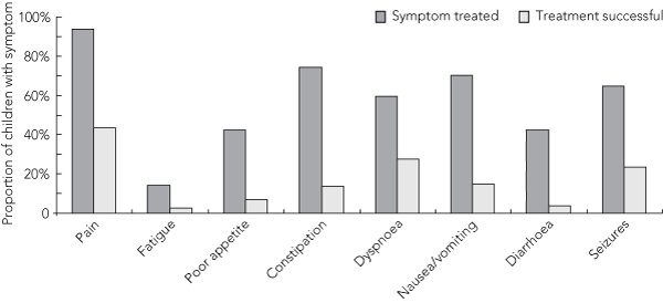The most successful treatments (expressed as the proportion of treated children whose treatment was successful) were those for pain (47%), dyspnoea (47%) and seizures (36%). The least successful treatments were for diarrhoea (9%), fatigue (18%) and poor appetite (17%) (Box 4). The implementation and success of treatments were not affected by whether the child died in hospital or at home, with one exception: dyspnoea was significantly more likely to be treated in children who died in hospital than in those who died at home (P = 0.02).
