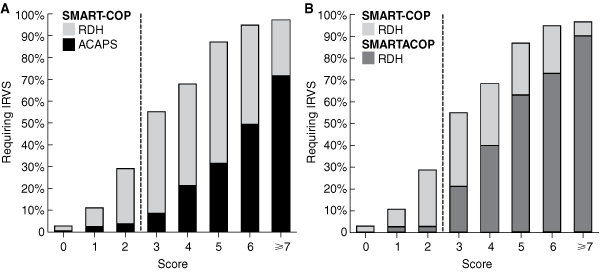 4 Risk of needing IRVS according to SMART-COP score in the RDH cohort compared with (A) ACAPS cohort and (B) SMARTACOP score in the RDH cohort