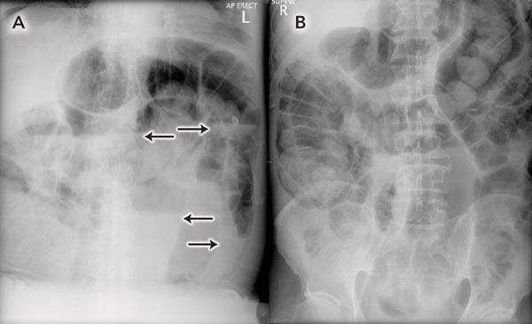 2 Erect (A) and supine (B) abdominal x-rays taken on admission