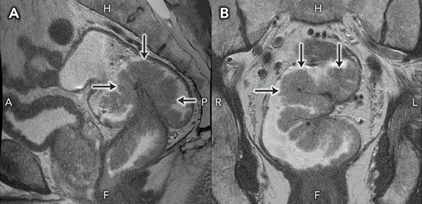 3 Sagittal (A) and coronal (B) magnetic resonance images of the causative lesion