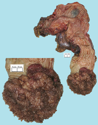 Staging magnetic resonance imaging of the pelvis performed on the day of discharge clearly demonstrated a large, sessile tumour arising from the left rectal wall (Box 3). Appearances were thought to be consistent with a T2 lesion. After 3 weeks of outpatient convalescence, the patient returned for elective low anterior resection, which revealed a large, exophytic lesion within the rectum (Box 4). Histopathological examination of the resected specimen (Box 5) confirmed hypersecretory tubulovillous adenoma with low-grade dysplasia.