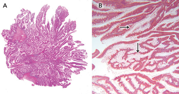 Cellular composition of non-secretory and secretory villous adenomas differs markedly. Light microscopy of non-secretory villous adenoma reveals relatively few goblet cells within the tumour epithelium, while much of the epithelial architecture of secretory adenomas is composed of these mucin-secreting structures. It has been postulated that the large surface area of the lesion participating in mucin production is a contributing factor to the volume of diarrhoea. The distal location of these lesions means there is a minimal area of normal colonic mucosa remaining to allow fluid absorption.5