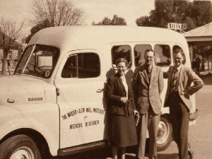 Drs Eric French, Gray Anderson and Leslie Frazer standing beside their mobile laboratory during field investigations of the 19501951 outbreak of Murray Valley encephalitis