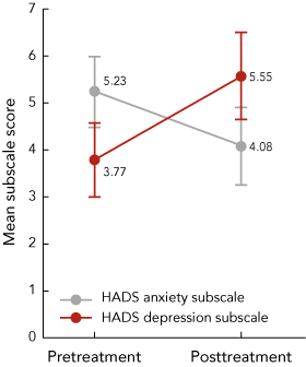 Results: Seventy-five participants completed pretreatment and posttreatment questionnaires. Mean depression scores increased significantly from before to after treatment, while anxiety scores decreased significantly over the same period. The prevalence of mild to severe depression was 15% before treatment and 31% after treatment. The prevalence of mild to severe symptoms of anxiety was 30% before treatment, reducing to 17% after treatment. Posttreatment depression was predicted by pretreatment depression and receiving chemotherapy. Posttreatment anxiety was predicted by pretreatment anxiety and male sex.