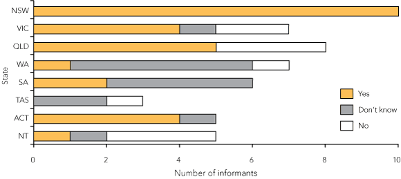 Although all states have apology laws that may apply to OD communications, knowledge of that fact was limited, except among participants from New South Wales and the Australian Capital Territory (Box 4). Unlike the general questions about perceived efficacy described above, this set of questions elicited knowledge of the laws actually in force in the participants’ jurisdiction. A majority of participants in four states and territories (Western Australia, South Australia, Tasmania and the Northern Territory) incorrectly said their jurisdiction did not have an apology law pertaining to OD, or were unsure whether it did. Overall, one in five participants (10/51) indicated that their jurisdiction did not have an apology law when it did, and one in four (14/51) did not know the answer.