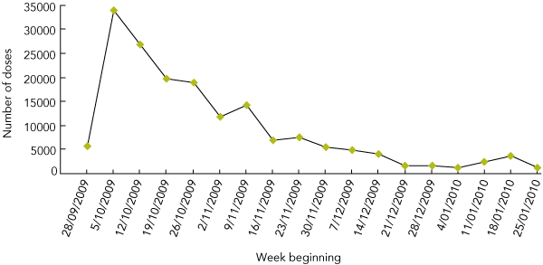 The first Australian case of pandemic (H1N1) 2009 influenza was identified on 9 May 2009, and infection quickly spread to all states and territories. By 28 May 2009, the Australian Government had ordered 21 million doses of pandemic influenza vaccine, initially with the aim of vaccinating 50% of the population (assuming a two-dose regimen) to contain community transmission and thereby protect those most at risk of severe disease.1,2 When the vaccine was registered, it had been shown that a single dose was adequate for people aged 10 years and older.3 Thus, there was sufficient vaccine for the entire population and all Australians aged 10 years and older were encouraged to be vaccinated, with particular efforts being paid to vaccinating vulnerable groups at high risk of severe influenza.4