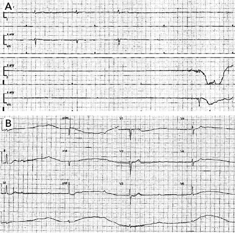 Cardiac monitoring telemetry trace (A) and ECG (B) showing complete heart block. |