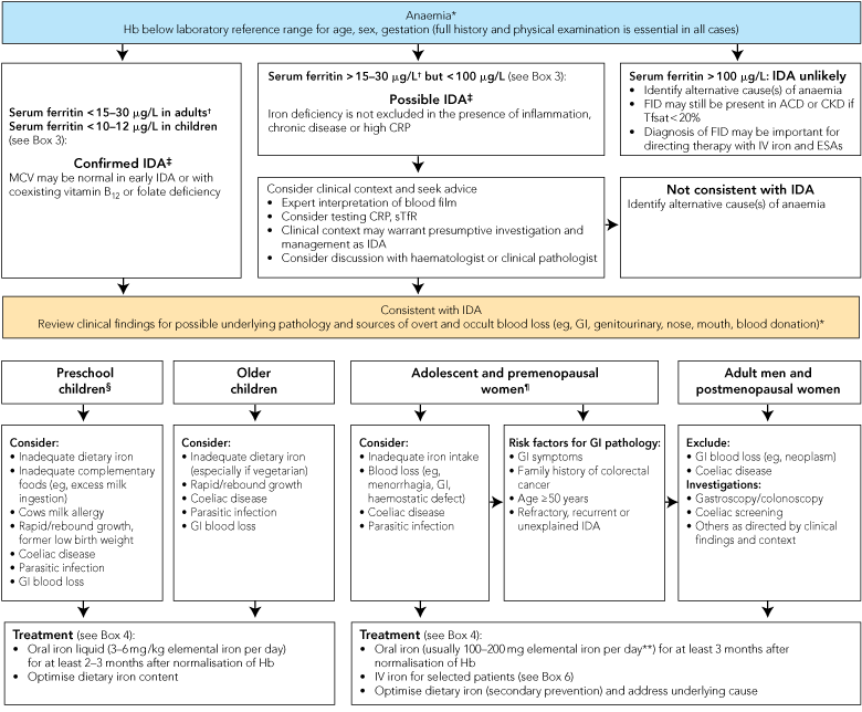 A recommended approach to assessment and management of IDA is outlined in Box 2. The underlying cause must be established in all patients. Importantly, in men and postmenopausal women with IDA, and also in some premenopausal women, evaluation for benign or malignant GI lesions, inflammatory conditions (such as inflammatory bowel disease) and peptic ulceration is indicated. Screening for coeliac disease should be performed.4,29
