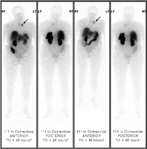 Localisation studies with a 123 I-metaiodobenzylguanidine scan identified increased tracer uptake within both the left adrenal region and left anterior mediastinum. Computed tomography and magnetic resonance imaging (MRI) scans showed large bilateral renal angiomyolipomas (AMLs), a right renal artery aneurysm, a bulky left adrenal gland with no discrete mass lesion, and a 15 mm calcified lesion within the left anterior mediastinum (not related to the sympathetic chain). Results of a positron emission tomography scan were negative. However, an octreotide scan showed mild tracer uptake in the left adrenal region and marked focal uptake within the left anterior mediastinum (Box 2).