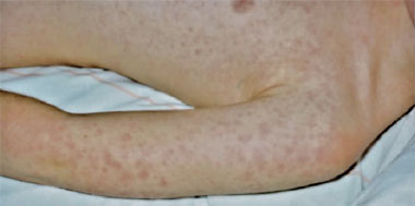 Patient B, a previously well 9-year-old girl, was admitted to a children’s hospital in Melbourne, Victoria, in April 2009 with severe abdominal pain, fevers to 39°C and a non-pruritic erythematous macular rash, initially present on the trunk and then spreading to the upper limbs and face (Box 1). The patient described a prodrome of 5 days of fever and malaise, with occasional vomiting and diarrhoea. She had been appropriately vaccinated, had no drug allergies, and did not regularly take any medication.