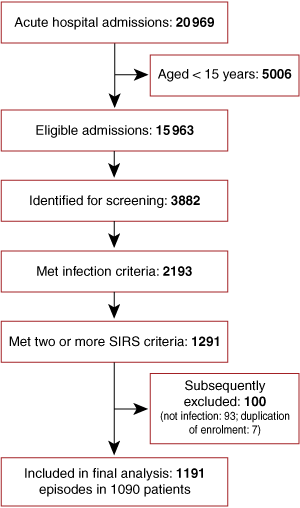 Most large studies of sepsis epidemiology are retrospective database analyses based on discharge coding,1,2,10 which is likely to significantly underestimate sepsis incidence.11 Most prospective studies are limited to patients requiring ICU admission,3,5 and are thus not representative of the true community burden of sepsis requiring hospitalisation. Patients with sepsis that requires hospital treatment, but not ICU admission, are common and have a high mortality rate,1 but these patients are under-represented in the medical literature.
