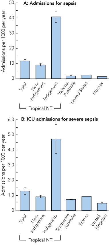 Compared with temperate areas of Australia,5 and the United Kingdom4 and France,22 the Top End has a significantly higher population-based incidence of severe sepsis requiring ICU admission, but this difference was entirely accounted for by the extremely high incidence in Indigenous people (Box 3, B). The rates of sepsis were about six times higher in our study than those reported from Victoria, a temperate region of Australia,21 and the US2 (Box 3, A), and much of this difference also derives from the rates in Indigenous people.