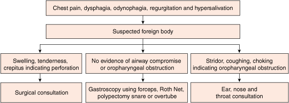 Clinical manifestations of oesophageal obstruction include chest pain, dysphagia, odynophagia, regurgitation and hypersalivation. Swelling, tenderness and crepitus may represent oropharyngeal or proximal oesophageal perforation. It is crucial to assess for airway compromise such as stridor, choking and coughing. This may result when the impaction occurs at the level of the upper oesophageal sphincter leading to tracheal compression. Complications of foreign body ingestion include obstruction, perforation, aspiration, tracheo-oesophageal fistula, aorto-oesophageal fistula, and abscess formation.5