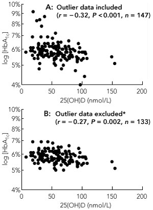 25(OH)D was inversely associated with both fasting and 2-hour BGLs during OGTT (Spearman r = − 0.16; P = 0.05 for both), but not with total daily insulin dose. There was a highly significant inverse association between 25(OH)D levels and log[HbA1c] (Spearman r = − 0.32; P < 0.001) (Box 2). The relationship remained significant after removal of HbA1c outliers that were > 7.5% (P < 0.001) and > 7% (P = 0.008). It also remained significant after removal of HbA1c values that were ≥ 6% (P = 0.02), even though this excluded 38% (56) of the study sample. Excluding both low (< 5%) and high (> 7%) HbA1c outliers also did not negate the relationship (r = − 0.27; P = 0.002) (Box 2).