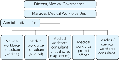 Hospital medical staff are also supported by a Medical Workforce Unit (MWU), with approachable, appropriately trained staff (Box 2). The MWU provides a single, on-site, open-door reference point for medical staff issues (recruitment and appointments, credentialling, safe rostering, and vacancy and leave management) and liaises with human resources personnel to facilitate employment of international medical graduates at RMH via a qualified migration agent. Human resources personnel are also involved in professional behaviour and disciplinary issues. The MWU manager provides peer support and support for industrial and professional issues. Medical workforce consultants and project officers provide a point of accountability and continuity over the junior medical training years and facilitate relationships with medical staff. They are responsible for recruitment, rostering and human resources support for junior and senior medical staff.