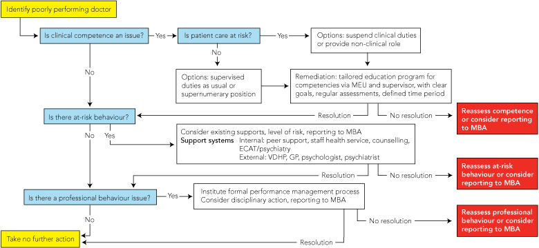 Ideally, poorly performing junior doctors self-present,25 either directly or indirectly, by requesting roster modifications, career advice or clinical skills training. Usually, however, issues of underperformance20 are identified by a fellow resident, registrar or a consultant supervisor, either during rotations or as part of formal assessments.26 Occasionally, they are identified through complaints from non-medical staff, patients or their families (particularly if there are issues regarding communication27). Notification of professional or impaired-practitioner issues is sometimes made to the Medical Board of Australia (MBA) (formerly to the Medical Practitioners Board of Victoria).28