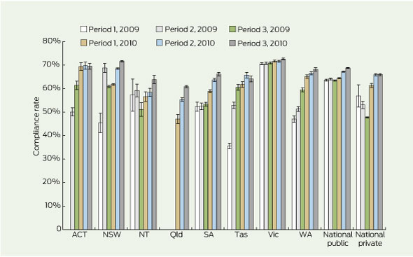 During 2009–2010, a total of 917 622 HH moments were assessed nationally; HH compliance rates are shown in Box 1. NHHI commencement varied by location, with the Northern Territory, SA, Tasmania, Victoria and WA starting in early 2009, NSW and the Australian Capital Territory in mid 2009, and Queensland in early 2010. In late 2010, the overall national rate of HH compliance was 68.3% (95% CI, 68.1%–68.5%; 168 641/246 931 moments) in 521 hospitals, representing about 90% of acute Australian public non-psychiatric hospital beds and about 50% of acute private hospital beds. These data compare with a national HH compliance rate at the start of the NHHI of 63.6% (95% CI, 63.2%–64.0%; 36 213/56 978; P < 0.001) (Box 1) — however, these baseline data were heavily influenced by Victoria, where a program using a similar audit tool had been in place for some years.1,2 For non-Victorian sites, overall HH compliance improved from mean baseline rates of 43.6% (95% CI, 42.8%–44.4%; 6431/14 740) and 53.5% (95% CI, 52.9%–54.0%; 16 547/30 934) in 2009 audit Periods 1 and 2, respectively, to 67.8% (95% CI, 67.5%–68.0%; 106 851/157 708) at the end of 2010 (P < 0.001 for both).